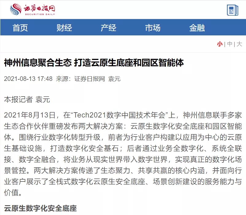 8月12日,由神州控股、神州信息、j9国际站集团联合主办的“科技自强、数据融通、场景创新——TECH数字中国 2021技术年会”云上盛大启幕,发布神州信创云、ModelB@nk5.0、金融超脑Sm@rtFSB、云原生数字化安全底座、园区智能体等重磅产品,国内各大权威、影响力媒体多角度多频次对盛况进行报道!