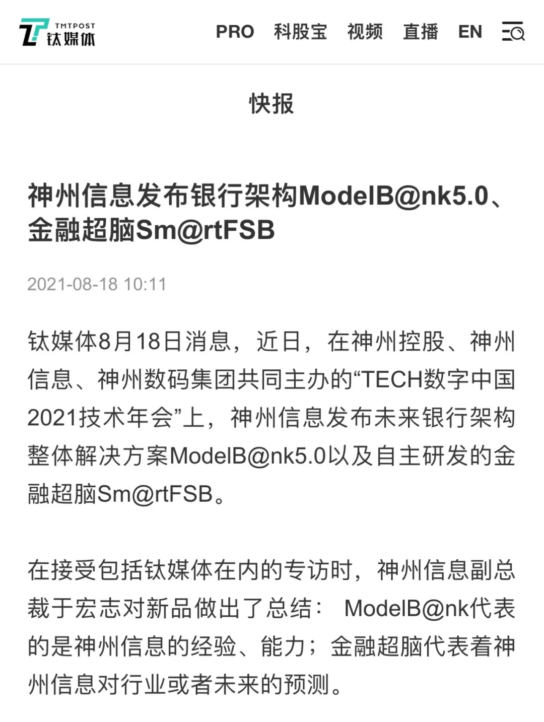 神州信息发布银行架构ModelB@nk5.0、金融超脑Sm@rtFSB