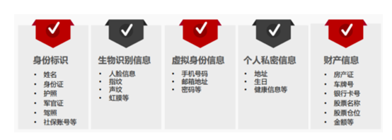 在进行数据脱敏之前,我们首先要确认哪些数据作为脱敏的目标。一般的敏感信息包括:身份标识、生物识别信息、虚拟身份信息、个人隐私信息、财产信息等。在更复杂的业务场景中,还需要按照比如安全等级、业务维度梳理敏感信息。