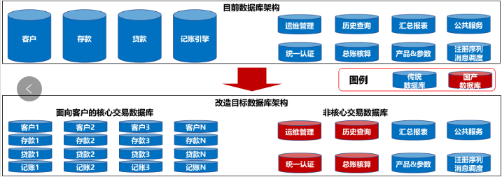 第二、通过联合方案金融客户可安全、简便地完成核心系统的升级改造,并满足性能需求。通过升级改造,在确保银行核心系统的高可靠性、高安全、高性能和数据强一致性的同时,并可以通过按业务系统对客户的影响程度分级,对数据库系统进行分类,可先对内部运维管理、历史查询、总账核算等非面向客户的数据库进行改造,不影响业务正常运行,针对面向客户的存款、贷款、记账等核心交易数据库,按照客户分片进行分库改造,分摊应用开发及测试工作发复杂度,降低运维难度,提高系统整体容错度,极大程度减少故障对日常业务的影响。