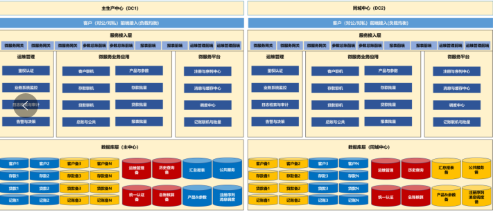 第一、同城双活高可用方案。金融行业核心系统架构升级方案中的同城双活高可用方案,两个中心均部署核心应用系统,按客户和业务进行应用分流,双中心的数据库互为主备高可用。