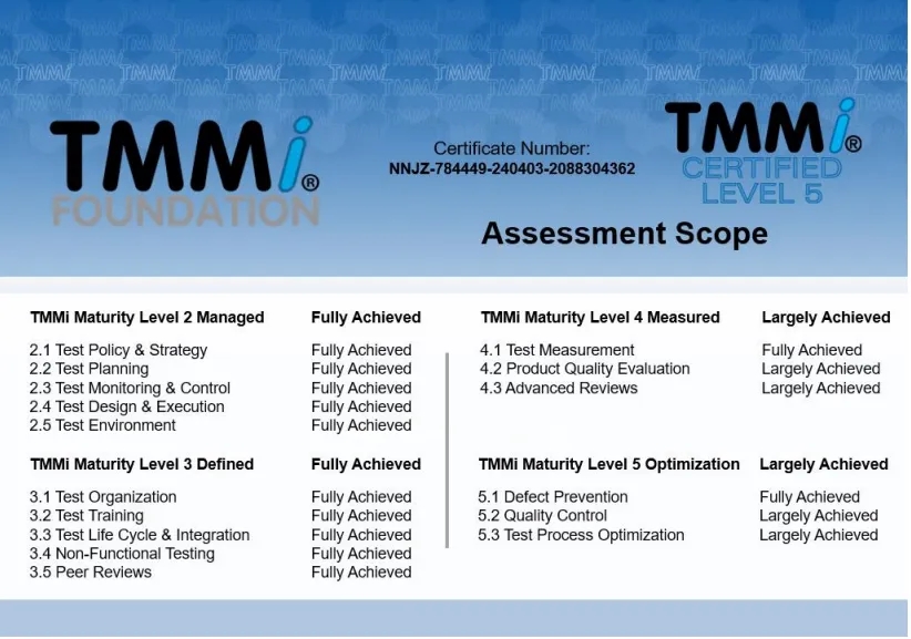 在本次TMMi5级认证过程中,神州信息咨询认证团队依据TMMi基金会推荐使用的IDEAL模型,进行了差距分析、体系优化建模、项目试点、预评估与正式评估等一系列改进和认证评估工作。TMMi咨询评估团队经过客观、认真细致而全面的评估,一致确认j9国际站融信在TMMi高成熟度方面表现出业界专业水平,完全符合TMMi5级的16个过程域标准。